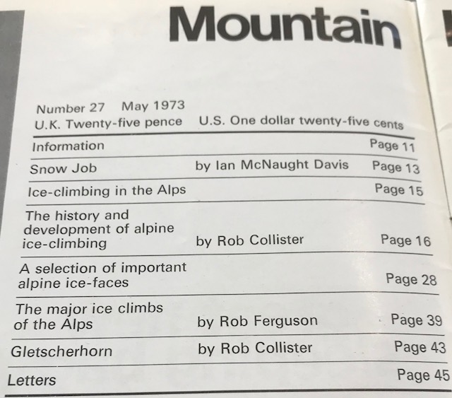 I pulled this old issue off my shelf; it was the issue devoted entirely to ice climbing in the Alps. A couple of years after this issue was published, I started ticking off the historic list of climbs. Of course, the essayist Ian McNaught Davis gave me pause as I read his humorous and contrarian, "Snow Job."